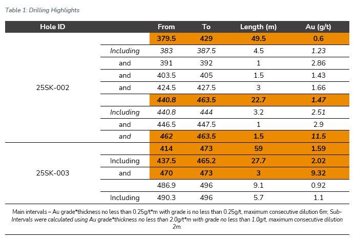 Drill hole 25SK-002 was drilled 140 m below drill hole 25SK-001, where drill hole 25SK-003 was drilled 200 m below previous shallow drilling and 100 m to the west of drill hole 25SK-001, which intercepted five distinct zones of gold mineralization across a 140 m drilled length, including 41.5 m of 1.23 g/t gold (see news release dated August 12, 2025). Highlights from the additional drilling include 49.5 m of 0.6 g/t gold and 22.7 m at 1.47 g/t gold from drill hole 25SK-002, as well as 59 m of 1.59 g/t gold and 9.1 m of 0.92 g/t gold from drill hole 25SK-003 (Table 1). The reported intercepts leave the mineralization at La Pointe Extension open at depth and along strike to the west (Figures 1, 2, and 3).