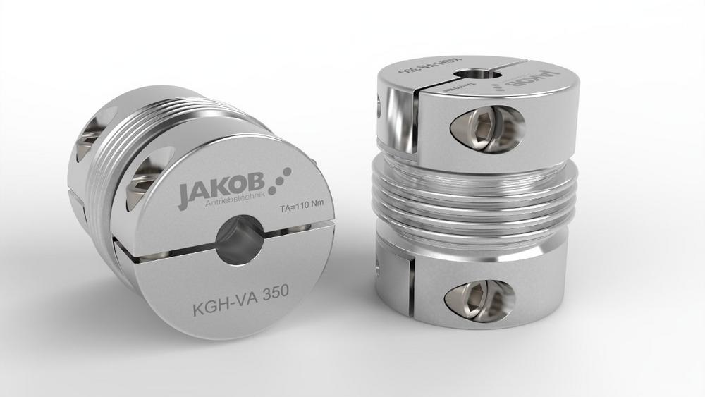 JAKOB Antriebstechnik bietet die Metallbalgkupplung KGH, die in der äußerst montagefreundlichen Halbschalennabenausführung gefertigt wird, auch als Edelstahlvariante an (KGH-VA). Montage und Demontage der Kupplung sind so selbst in beengten Einbauverhältnissen keine Schwierigkeit mehr. Die festen Nabenhälften werden auf die Welle aufgelegt und mit den losen Halbschalenstücken verschraubt. Gerade bei feststehenden Wellenzapfen kann der Servicefall bedeuten, dass die Antriebs- und/oder Abtriebseinheit umständlich demontiert werden müssen, was somit entfällt. Durch die rostfreie Edelstahlbauweise ist sie auch für Einsätze im Lebensmittelbereich und der Medizintechnik hervorragend geeignet.