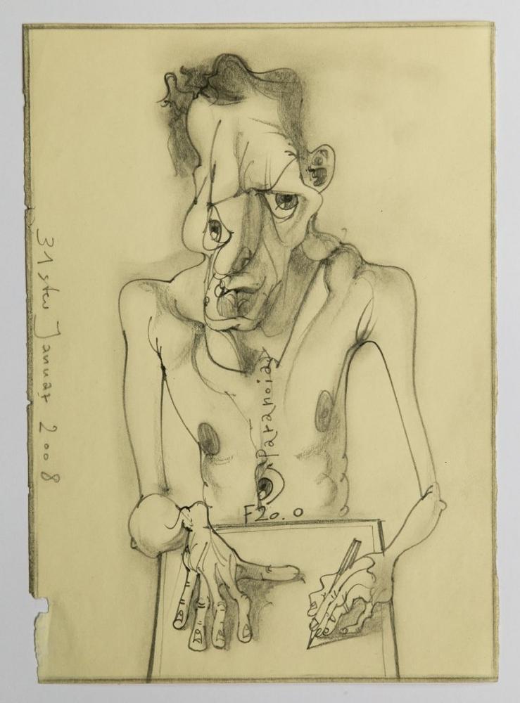 In der Fachsprache wird die Erkrankung „Psychose“ mit dem Code „F20.0“ verschlüsselt. Diese Verschlüsselung taucht als eine sich wiederholende, leere Floskel in den Arbeiten auf. Das Stigma der Diagnose jedoch, welches eine weitere Belastung für die lädierte Seele darstellt, lässt sich aus den Zeichnungen nur erahnen. „Der Griff zum Bleistift ist für mich daher ebenso ein Mittel der Gegenwehr“, bekennt Karsten Kirschke: „Ich bin weitaus mehr als meine Diagnose, wenn ich denn bereit bin, mir Fragen zu stellen, die kein Arzt mir beantworten kann“.
