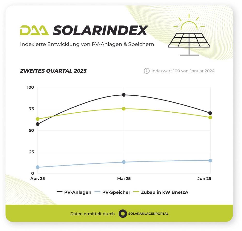 Im zweiten Quartal 2025 war die Nachfrage nach PV-Anlagen bei DAA – saisontypisch – höher als im ersten Quartal. Der Top-Wert unter den indexierten Zahlen lag bei 75 im Mai. In absoluten Zahlen übertraf der Wert bei DAA den des Vorjahresmonats. Das Interesse an Stromspeichern ist bei DAA im Q2 2025 gering.