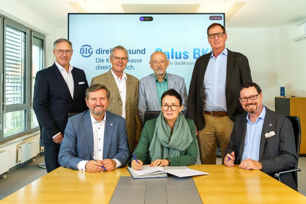 Bildzeile: Den Kooperationsvertrag mit dem Ziel einer Fusion zwischen der BIG direkt gesund und der Salus BKK unterzeichneten Ute Schrader, Vorständin der Salus BKK, Peter Kaetsch (vorn links), Vorstandsvorsitzender der BIG direkt gesund, und Markus Bäumer (vorn rechts), stellvertretender Vorstandsvorsitzender der BIG. Den wegweisenden Beschluss hatten zuvor die Verwaltungsräte der beiden Kassen gefasst, vertreten auf dem Foto durch die alternierenden Verwaltungsratsvorsitzenden (oben von links) Robert Leitl und Helmut Krause von der BIG, sowie Uwe Bratje und Albrecht Ehlers von der Salus BKK. (©BIG direkt gesund/Christian Laukemper)