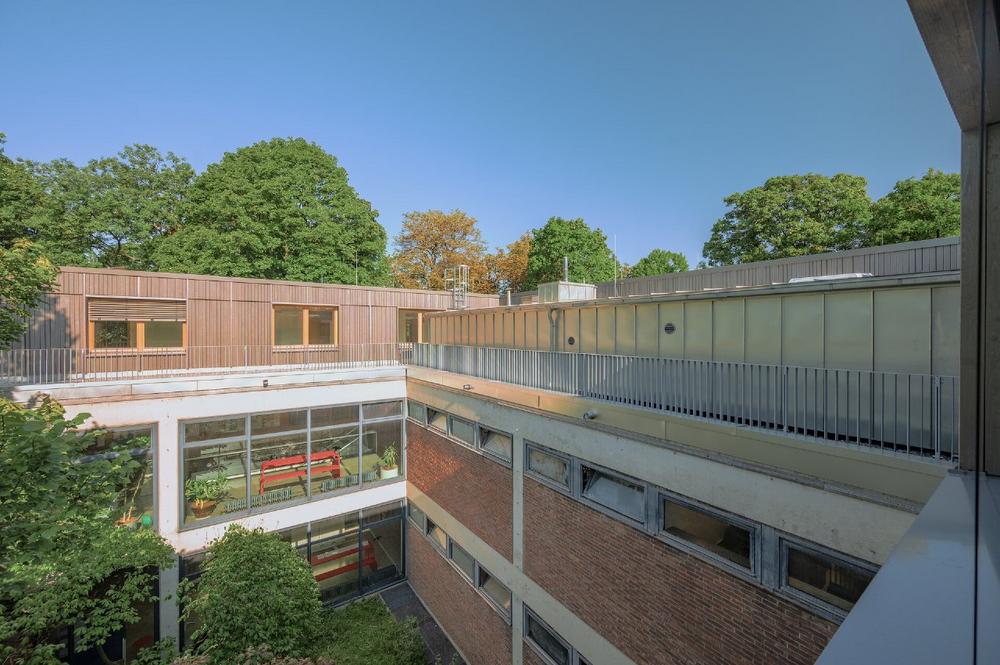 Das architektonische Erscheinungsbild der Erweiterung wird durch eine vorvergraute, hinterlüftete Holzfassade geprägt, die in Kombination mit einer neuen Stehfalzfassade am Betonaufbau einen differenzierten Materialkontrast erzeugt. Als verbindendes Element wurde zudem eine großzügige Dachterrasse mit extensiver Begrünung realisiert, die den Nutzerinnen und Nutzern attraktive Außenräume bietet. Im Innenraum sorgen sichtbare Holzoberflächen für eine hochwertige Atmosphäre und ein angenehmes Raumklima.