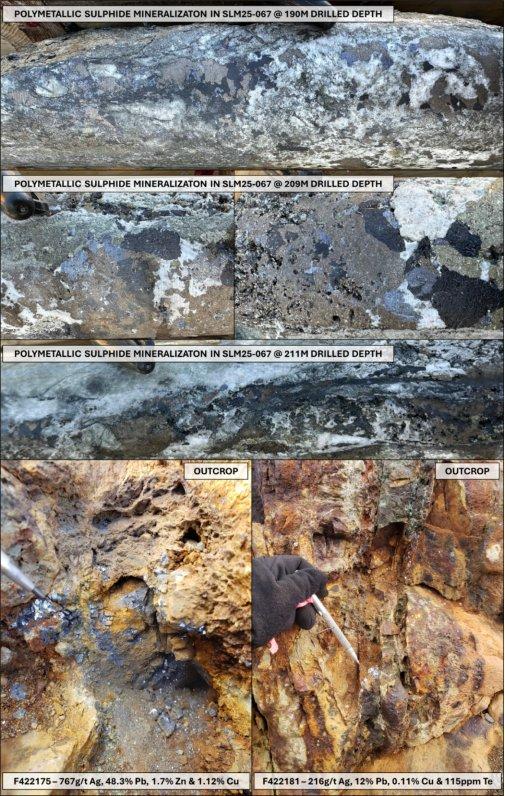 – Die Bohrung SLM25-068 zielte auf eine Reihe von silberreichen Galenit-Pyrit-Tafelgängen ab, die in einer kretazischen mafischen Intrusion beherbergt sind, und durchteufte erfolgreich eine mäßig bis sehr dichte Gangbildung über 32 m. Oberflächenproben, die an dieser Stelle im Jahr 2024 entnommen wurden, enthielten 216 g/t Ag, 12 % Pb, 0,11 % Cu und 115 ppm Te (F422181).