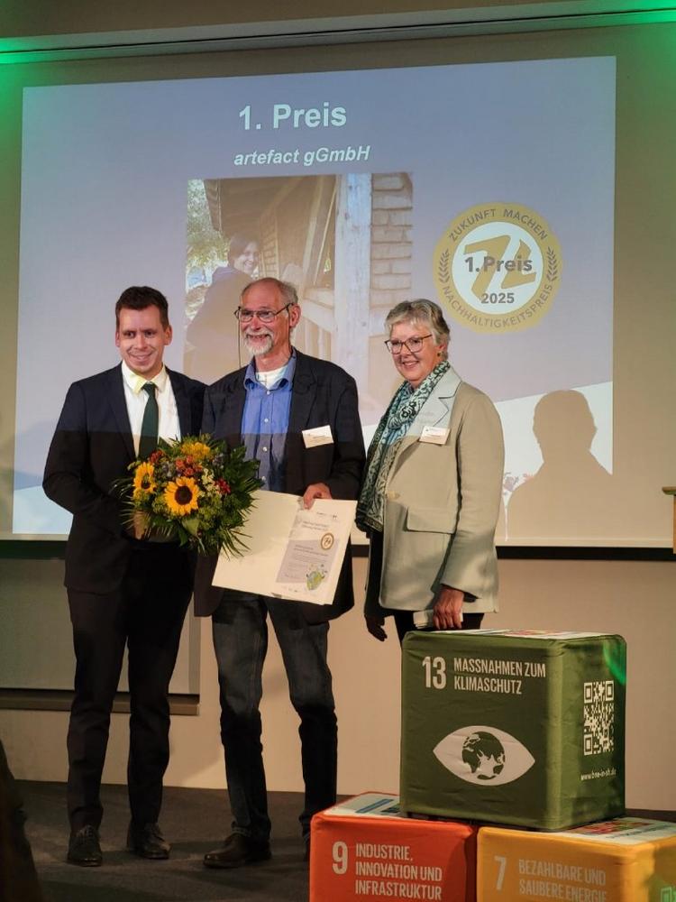 In den Achtziger Jahren hatte der Baustoff Lehm ein eher verstaubtes Image, galt als altmodisch, industriell schlecht zu verarbeiten und Arme-Leute-Baustoff. Trotzdem entschieden sich die Gründer des Zentrums für nachhaltige Entwicklung, artefact in Glücksburg, damals für das Material, das zahlreiche positive Faktoren vereinigt: „Lehm ist fast überall lokal vorhanden und immer wieder recyclingfähig. Für Handwerkerhände wie für die Atemwege der Hausbewohner ist er eine Erholung. Die Energiebilanz ist gegenüber Ziegeln und Betonprodukten hervorragend – in Zeiten der Diskussion über Carbon Capture and Storage unter der Nordsee zur teuren Entsorgung der Zementherstellungsfolgen ein hochaktueller Aspekt.“ begründete Werner Kiwitt von artefact die zukunftsweisende Entscheidung. Zur Attraktivierung der Bauweise wurden auch ungewöhnliche Gewölbe und Kuppeln aus Lehm in die Architektur integriert. Der Dachverband Lehm wurde 1993 auf der Baustelle in Glücksburg und in Molfsee gegründet, zehn Jahre später eine Prüfungsordnung mit der Handwerkskammer Flensburg für den Berufsabschluss „Fachkraft Lehmbau“ auf den Weg gebracht. Trotzdem dauerte es fast 30 Jahre, bis der erste Qualifizierungskurs in Norddeutschland durchgeführt werden konnte. In mittlerweile vier Jahrgängen konnten 50 Zimmerleute, Bauingenieurinnen, Architekten und Handwerker weitergebildet und erfolgreich geprüft werden. Ein norddeutsches Kompetenznetzwerk bildet sich mit weiteren Schnittmengen und neuen Innovationen wie Wandheizungssystemen im Lehmputz. „Diese Auszeichnung ermutigt uns und Andere, in nicht immer einfachen Zeiten nicht gleich aufzustecken, sondern mit langem Atem für positive Veränderungen einzutreten.“ so Kiwitt. Für Selbstbau-interessierte Laien findet in Glücksburg gerade ein Einführungskurs zu Lehm- und Kalkbau statt (s.a. www.artefact.de ).