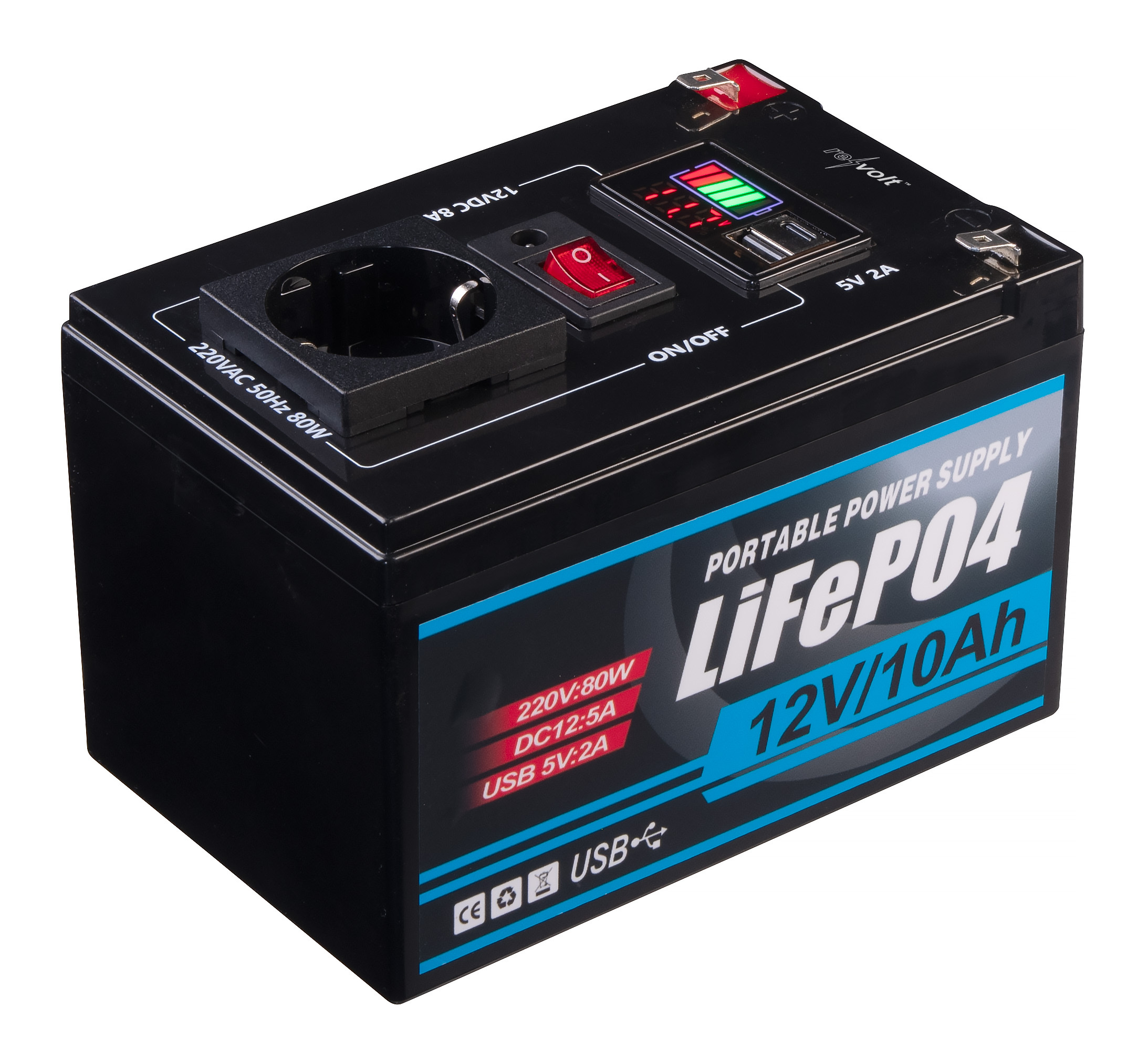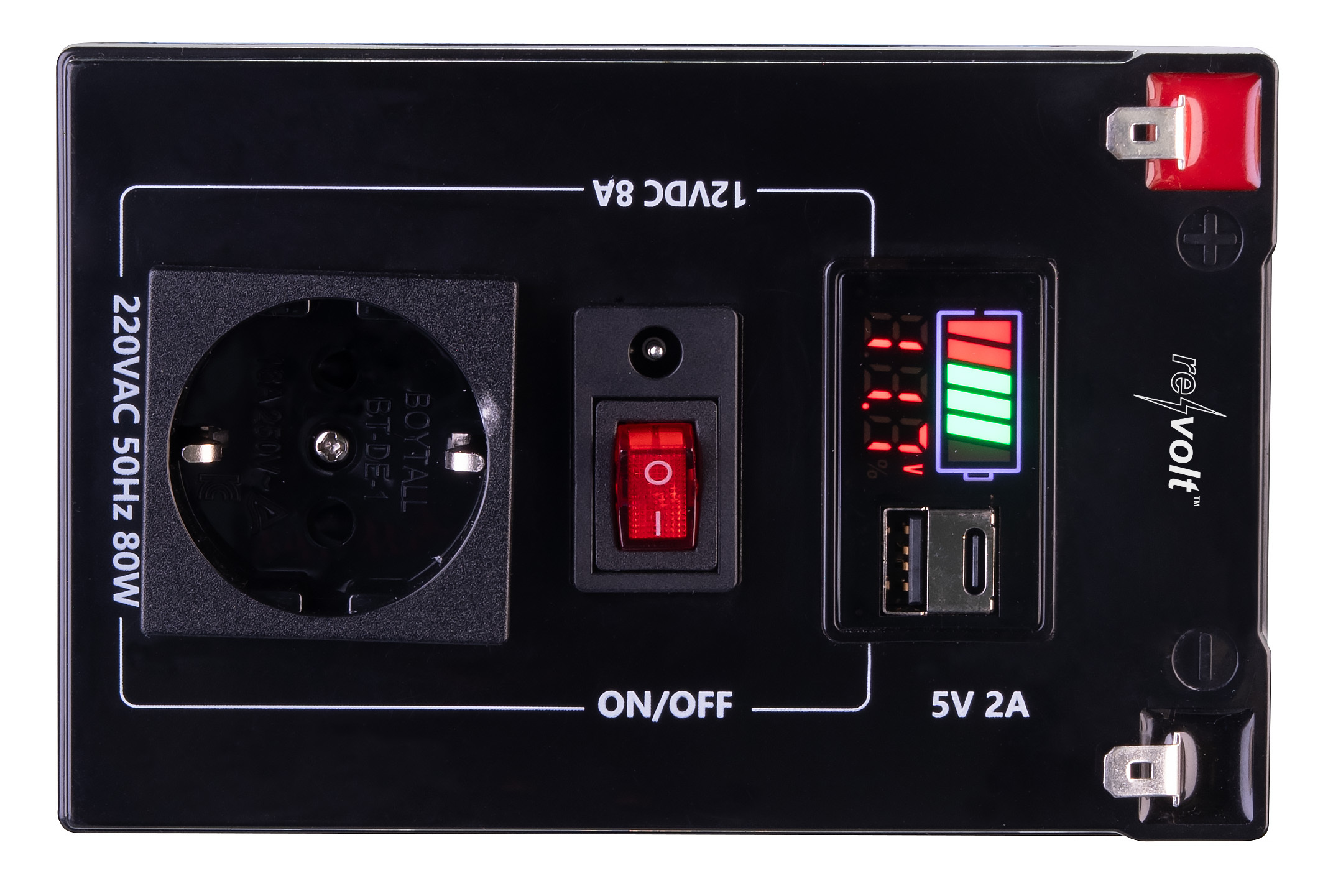 - 230-V-Steckdose mit 80 W, USB-A-, USB-C- & DC5521-Anschluss, Polklemmen