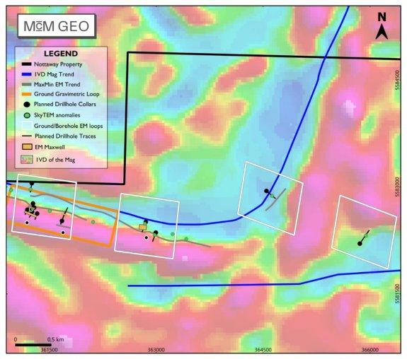 – In und im Umfeld des Nottaway Shear Corridor gibt es nach wie vor mehrere unerprobte elektromagnetische (EM) Leiter, was ein bedeutendes unerschlossenes Potenzial für die Auffindung einer Mineralisierung im Zusammenhang mit Massivsulfiden erkennen lässt.