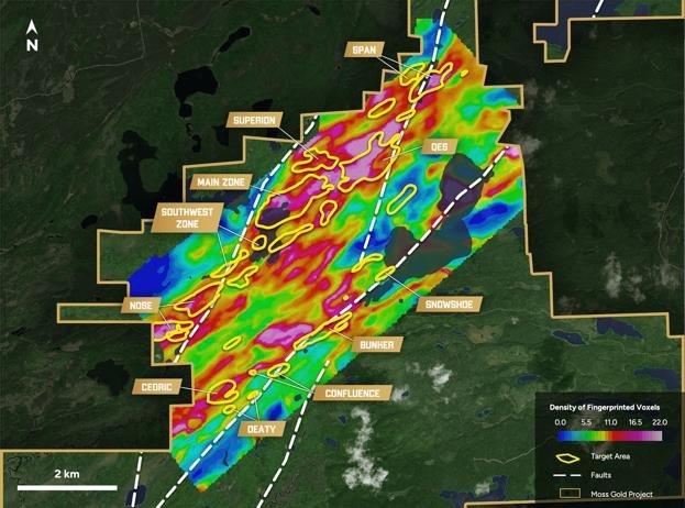 This geophysical “fingerprint” was highlighted across the survey area as prospective geophysical targets for Moss-style mineralization. This approach was successfully tested against the Moss Nose target area, where surface gold mineralization is hosted in a similar stratigraphic environment to the Moss Gold Deposit. Based on this successful correlation, additional “Moss fingerprinted” areas identified in the survey have been integrated into the targeting strategy.