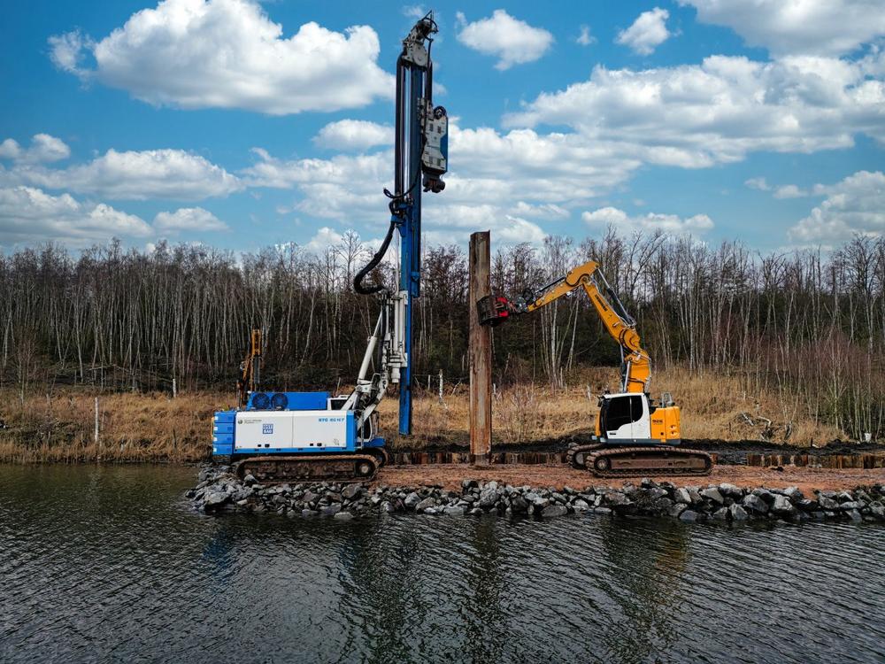 Die Arbeiten am See waren technisch anspruchsvoll und erforderten maßgeschneiderte Lösungen. In der ersten Bauphase wurde eine stabile Arbeitsebene geschaffen, um das 65-Tonnen-Rammgeräts RG 16 T einsetzen zu können. Anschließend sicherten wir den Böschungsfuß an der Ostseite durch Spundwände und gezieltem Bodenaustausch. Für den Einsatz von Schwimmtechnik wie Pontons und eine Klappschute wurde zudem eine zusätzliche Anlegestelle errichtet.