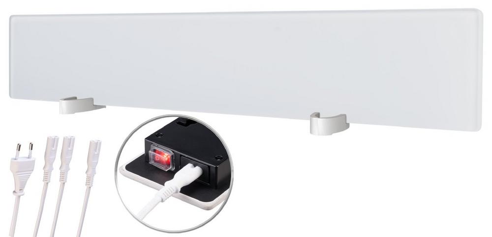 - Infrarot-Heizung inklusive Anschlusskabel, Verbindungskabel für weiteres Gerät, Standfüße, Montagematerial, Bohrschablone und deutscher Anleitung