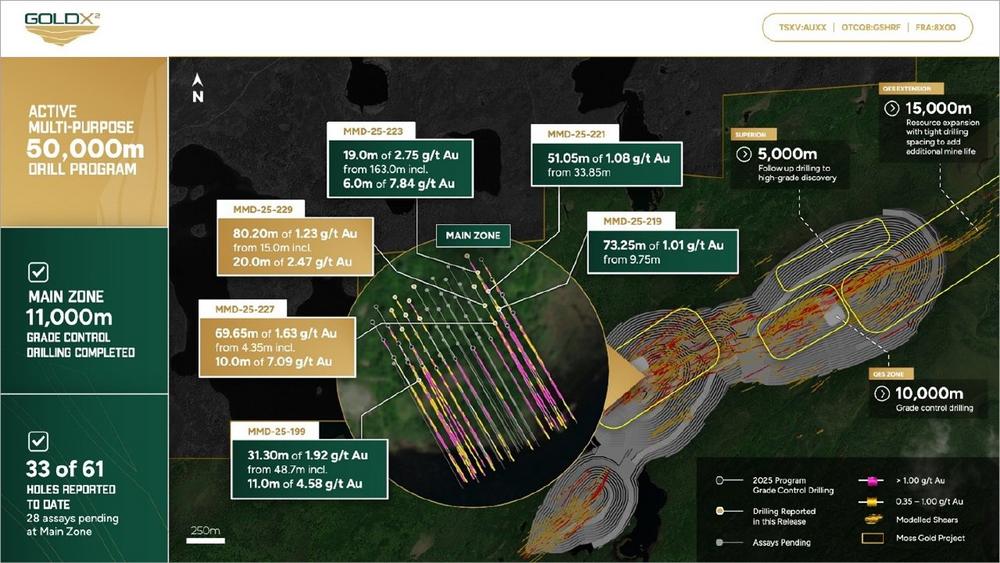Michael Henrichsen, CEO von Gold X2, erklärte: „Unsere neuesten Bohrergebnisse belegen weiterhin die hervorragende Kontinuität der Mineralisierung in der Hauptzone von Moss. Diese Ergebnisse bestätigen unser geologisches Modell, das wir in unserer bevorstehenden Mineralressourcenschätzung verwenden werden, die zusammen mit der PEA veröffentlicht wird. Darüber hinaus werden die Ergebnisse der Bohrungen zur Qualitätskontrolle dazu beitragen, den Abstand für das Infill-Bohrprogramm zu definieren, während wir darauf hinarbeiten, die Lagerstätte Moss in Richtung einer zukünftigen Machbarkeitsstudie voranzubringen.”