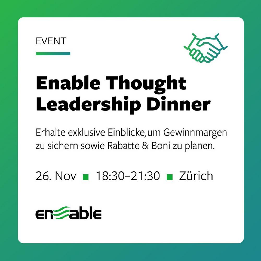 Volatile Rohstoffpreise, unsichere Lieferströme und Steigende US-Zölle: Was früher die Ausnahme war, ist heute Alltag für Finance-Verantwortliche. Enable, führender Anbieter für Pricing und Rebate-Management-Lösungen, lädt am 26. November 2025 zum Thought Leadership Dinner „Navigating Market Volatility & Trade Flows – Protecting Margin, Forecasting Profitability" in Zürich ein.