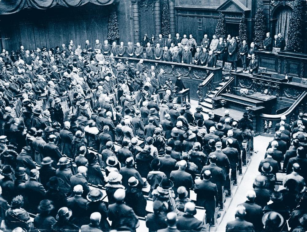 Die erste offizielle Feierstunde fand 1922 im Deutschen Reichstag in Berlin statt. Der damalige Reichstagspräsident und SPD-Abgeordnete Paul Löbe hielt eine im In- und Ausland vielbeachtete Rede, denn er stellte einer Gegenwart voller Feindseligkeiten den Gedanken an Versöhnung und Verständigung gegenüber. „… Leiden zu lindern, Wunden zu heilen, aber auch Tote zu ehren, Verlorene zu beklagen, bedeutet Abkehr vom Hass, bedeutet Hinkehr zur Liebe, und unsere Welt hat die Liebe not…“