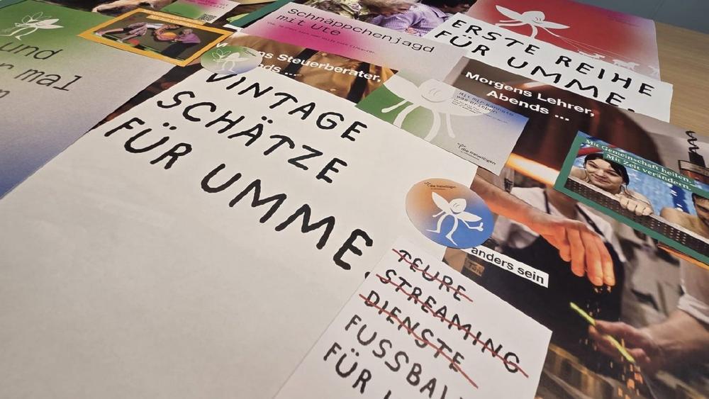Weniger bunt, aber nicht minder laut: die Kampagne von Marie, Leonie und Mika. Viel Weißraum, Krakelschrift, ein Satz, der hängen bleibt. „für umme“, also: umsonst.