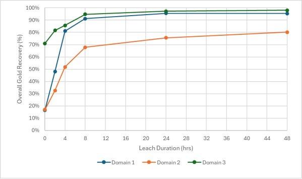 – Bereich 2 erzielte nach 48 Stunden eine Goldgewinnungsrate von 17 % mittels Gravitation und eine gesamte Gewinnungsrate von 80,1 %, wobei die Laugung noch im Gange ist (siehe Abbildung 1). Für Bereich 2 sind weitere Testarbeiten geplant, um die mineralogischen und chemischen Faktoren zu untersuchen, die die Laugungsraten beeinflussen, und um alle identifizierten Verbesserungen in die zukünftigen Testprogramme einzubeziehen.
