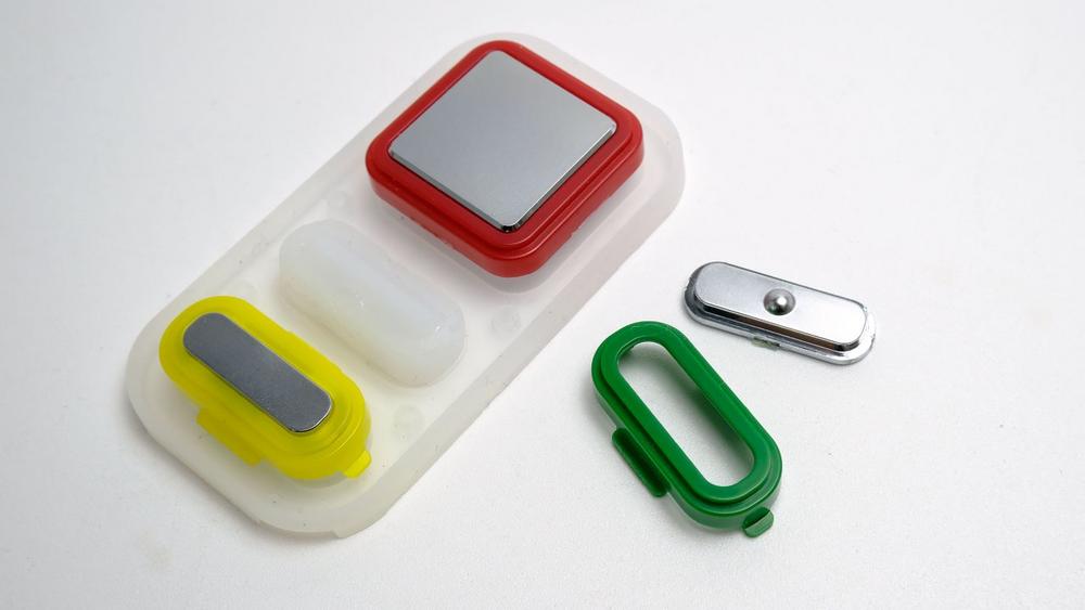 Im Zentrum des Projekts standen zweiteilige Kunststofftasten, die sich aus einem farbigen Rahmen und einer versilberten Betätigungskappe zusammensetzen. Die silberne Oberfläche ist matt strukturiert und erzeugt einen modernen Edelstahl-Look – dauerhaft, kratzfest und hochwertig im Erscheinungsbild. Der umlaufende Rahmen ermöglicht eine eindeutige Funktionszuordnung und bietet große Designfreiheiten bei der Farbgestaltung.