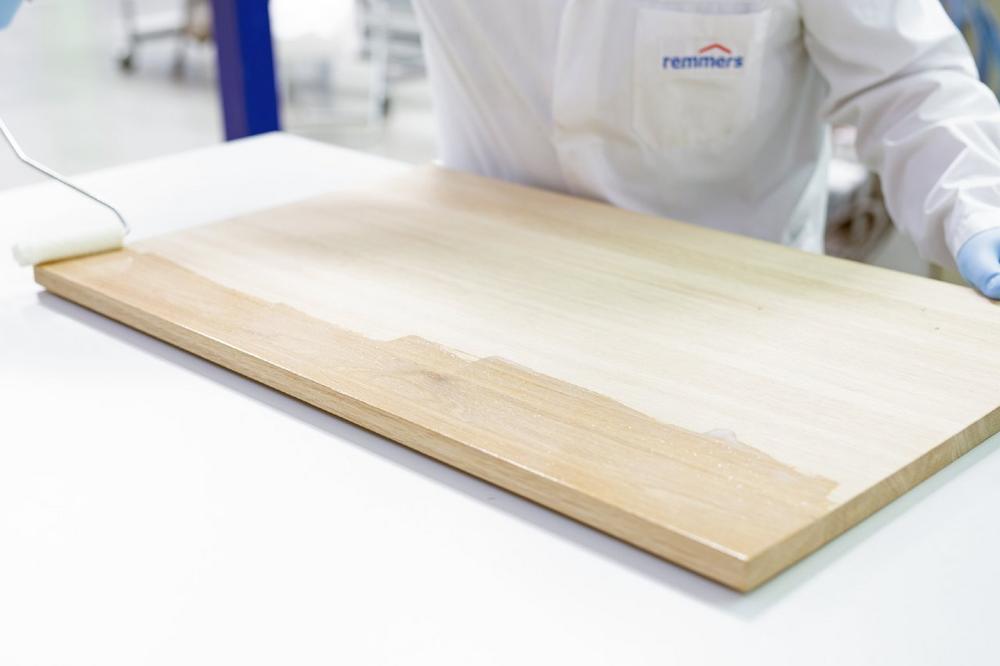 - Vorbereitung: Hierzu erfolgt ein Schliff in Körnung P180. Um die hohen Ansprüche an die Oberflächengüte zu erfüllen, lohnt sich das vorherige Wässern. Bei ringporigen Holzarten, z. B. Eiche, sollte die Oberfläche mit einer weichen Bronze-Messingbürste bearbeitet werden. Zur Farbgebung kann das Remmers Aqua-Beizen Sortiment eingesetzt werden.