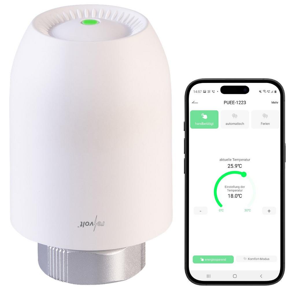 Beim Heizen Energie und Geld sparen: Das smarte Heizkörper-Thermostat von revolt lässt sich per Bluetooth mit dem Smartphone verbinden. So kann die Raumtemperatur bequem vom Smartphone aus gesteuert werden. Über die App können Heizzeiten direkt eingestellt und an den Tagesablauf angepasst werden. Die Kopplung erfolgt per QR-Code. Das Thermostat passt auf gängige Ventile und bietet ein Wochenprogramm mit bis zu neun Schaltzeiten pro Tag, eine Fenster-offen-Erkennung sowie die Modi Komfort, ECO und Urlaub. Der Batteriebetrieb ermöglicht eine Laufzeit von bis zu 18 Monaten. Die Installation erfolgt ohne Werkzeug.