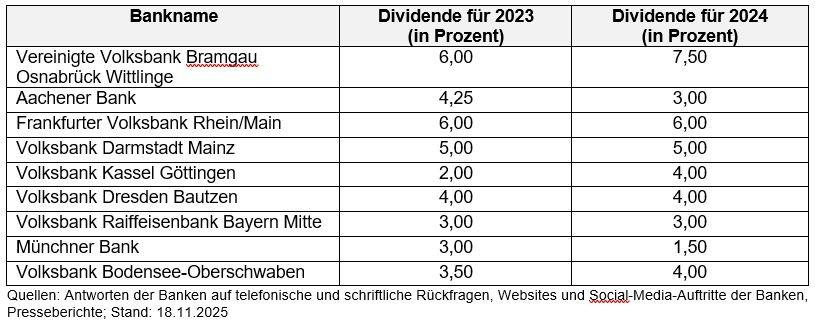 Man muss wissen: Die bei diesen Häusern angelegten Gelder der Mitglieder oder Genossen konkurrieren mit den anderen Bankofferten. Und da die meisten Volks- und Raiffeisenbanken im letzten Jahr wieder solide Erträge erwirtschaftet haben, konnten sie in diesem Jahr auch höhere Dividenden an ihre Miteigentümer ausschütten. Durchschnittlich waren es laut biallo.de satte 3,90 Prozent.