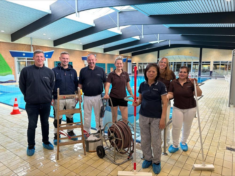 Wie jedes Jahr wird zudem das komplette Bad bis in die entlegensten Bereiche gründlich gereinigt – von den Ruhe- und Liegebereichen über das Babybecken bis hin zu schwer zugänglichen Stellen wie den Holzbalken unter der Decke. Auch Duschen und Umkleiden erhalten eine umfassende Grundreinigung. Die Arbeiten werden vom Team des Bauhofs, den Mitarbeitenden des Hallenbad- und Saunabereichs sowie vom Reinigungs- und Technikteam des Kurverein Neuharlingersiel e.V. durchgeführt.
