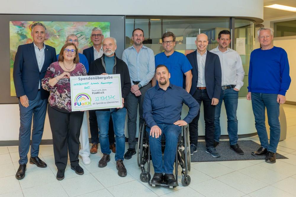 Seit mehr als 20 Jahren veranstalten die Unternehmen der Automeile Husarenlager in Karlsruhe im Herbst ihr traditionelles Oktoberfest mit einem bunten Programm. Die Erlöse der Tombola sowie Spenden der mitwirkenden Unternehmen gehen dabei seit jeher an den Förderverein zur Unterstützung der onkologischen Abteilung der Kinderklinik Karlsruhe e.V. (FUoKK). In diesem Jahr kamen mehr als 22.000 Euro zusammen, die Vertreter der beteiligten Unternehmen jetzt im Städtischen Klinikum Karlsruhe offiziell übergeben haben.