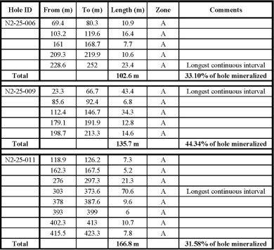 Das Unternehmen freut sich bekannt zu geben, dass es im Rahmen seiner Phase-1-Bohrkampagne bei N2 mit drei (3) weiteren Bohrlöchern bedeutende Abschnitte der anvisierten Mineralisierung durchteuft hat.