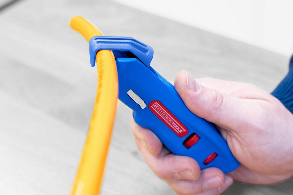 Für Kabel, die sich nicht einfach per Rund- und Längsschnitt entmanteln lassen, hat Weicon Tools ein Werkzeug entwickelt, mit dem zusätzlich ein Spiralschnitt möglich ist und mit dem anspruchsvolle Isolierungen leicht entfernt werden können – das Kabelmesser No. S 4-28 Spiral.