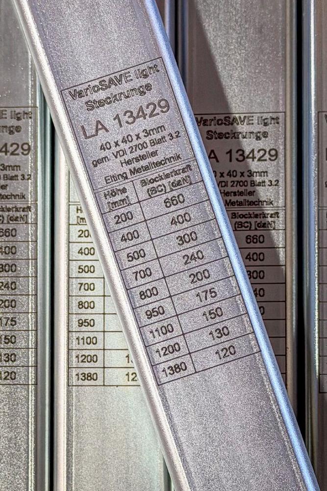 Um die Vorgaben normkonform zu erfüllen, gleichzeitig auch, wie in der Richtlinie gefordert, eine komfortable und dauerhaft gut lesbare Lösung für den Anwender zu bieten und die Kennzeichnung vor Witterung und Beschädigungen zu schützen, hat Elting sich für eine besonders robuste Umsetzung entschieden: „Wir versehen all unsere verzinkten VarioSAVE-Steckrungen an mehreren Positionen mit einer nahezu unzerstörbaren Lasergravur. Das bedeutet für den Anwender: vollständige Rückverfolgbarkeit über die Chargenverwaltung, eindeutige Herstellerkennzeichnung sowie die klar ausgewiesenen Blockierkräfte in den jeweils relevanten Angriffshöhen – alles dauerhaft sichtbar und benutzerfreundlich angebracht.“