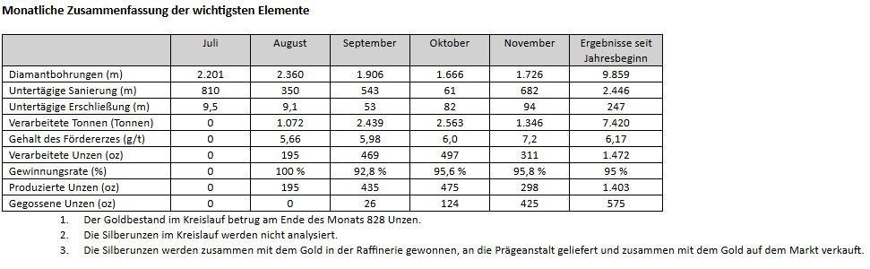 Im November trieb Abcourt die Erschließung seiner Abbaustätten voran und setzte die Einstellung von Personal fort. Abcourt fügte wie geplant einen vierten Abbaubereich hinzu. Die geringere Tonnage im November war auf die Erschließungsabfolge bei zwei der vier Abbaubereiche zurückzuführen. Die sichere Erschließung der Abbaustätten war eine Frage des Zeitpunkts, so war beispielsweise die Verlegung der Belüftung auf die nächste Unterebene in einer der Abbaustätten erforderlich.