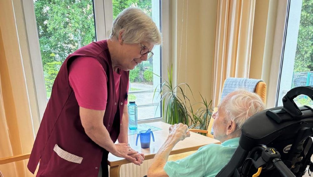 Begeistert erzählt sie auch von den vielen Festen, die hier im Pflegewohnheim gefeiert werden – zu Weihnachten, zu Ostern oder im Sommer. „Dann wird die Terrasse für alle zur Tanzfläche, egal ob mit Rollator oder im Rollstuhl. Wir haben wirklich viel Spaß hier“, sagt sie fröhlich. Ein Höhepunkt für alle Bewohnerinnen und Bewohner sei auch immer das gemeinsame Singen mit einem Akkordeonspieler, der regelmäßig zu Besuch kommt. „Viele können die alten Volkslieder von der ersten bis zur letzten Strophe mitsingen“, sagt Helga Smolka anerkennend. „Das verwundert mich immer wieder.“