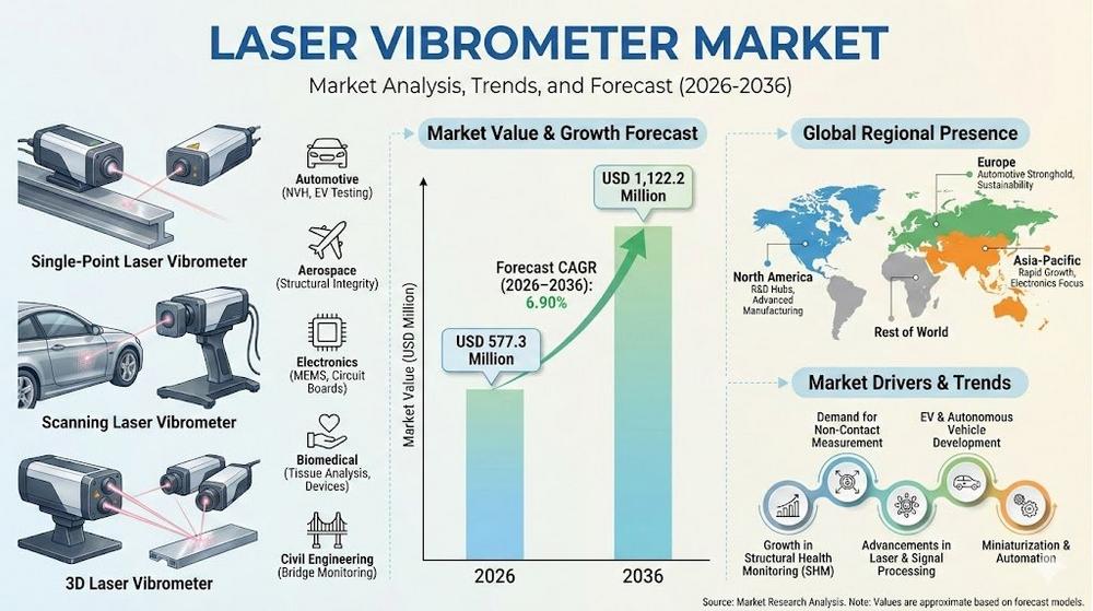 The global laser vibrometer market is entering a phase of sustained, technology-led growth as industries increasingly rely on non-contact vibration measurement for accuracy, safety, and efficiency. Valued at USD 577.3 million in 2026, the market is forecast to reach USD 1,122.2 million by 2036, expanding at a CAGR of 6.90% over the period. This growth reflects rising demand from automotive, aerospace, electronics, and advanced manufacturing sectors that require high-resolution vibration diagnostics without physical contact.