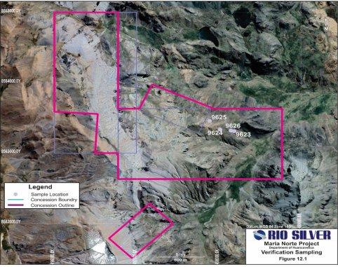 Karte mit den Konzessionsgrenzen und den Standorten der Verifizierungsprobenahmen an der Oberfläche des hochgradigen Silberprojekts Maria Norte von Rio Silver im Zentrum von Peru.
