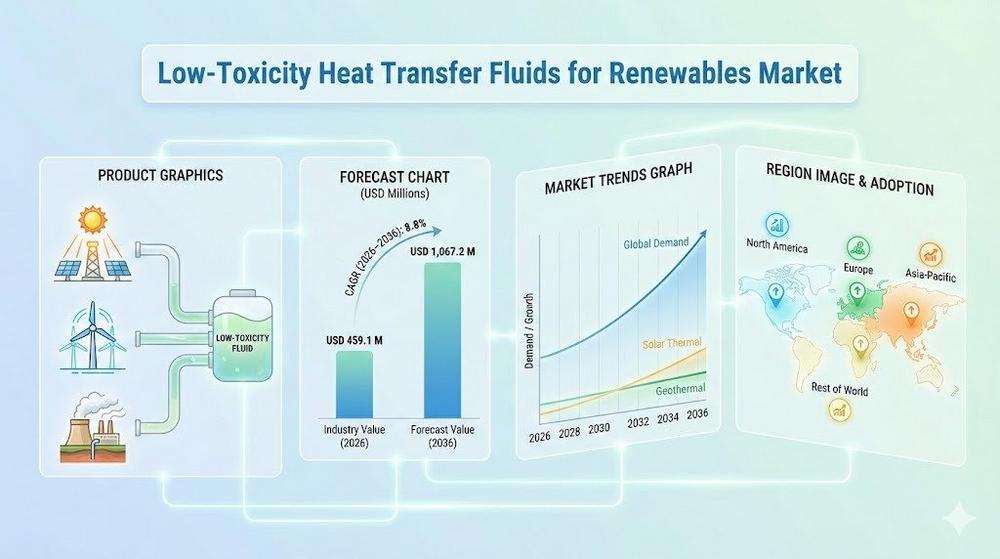 The Low-Toxicity Heat Transfer Fluids for Renewables Market is experiencing unprecedented growth, driven by the global push for sustainable energy solutions. Currently valued at USD 459.1 million in 2026, the market is projected to reach USD 1,067.2 million by 2036, growing at a CAGR of 8.8%. The increasing adoption of renewable technologies such as concentrated solar power (CSP), geothermal, and biomass systems is fueling demand for heat transfer fluids (HTFs) that are both efficient and environmentally safe.