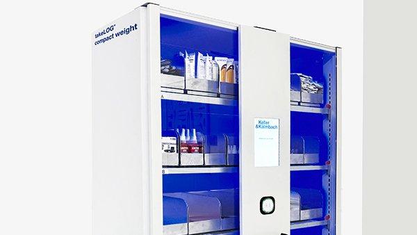 Der takeLOG® compact weight ist ein Ausgabeautomat mit Wiegenzellentechnik, der automatisch eine Bestellung an Keller & Kalmbach übersendet, wenn eine festgelegte Gewichtsgrenze unterschritten wird. Das Besondere dabei: Es gibt keinen Bedienscreen! Sie loggen sich ganz einfach mit Ihrem Chip am Kartenleser ein, öffnen die Tür, entnehmen die gewünschte Ware und der Automat erledigt den Rest.