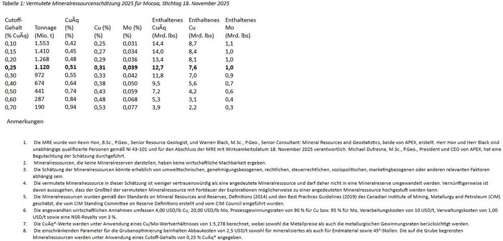 1Nähere Informationen entnehmen Sie bitte dem NI 43-101-konformen technischen Bericht mit dem Titel „Technical Report and Updated Mineral Resource Estimate for The Mocoa Project, Putumayo Department, Colombia“ vom 8. Januar 2026, der von Michael Dufresne (P.Geo, P.Geol, MSc), Warren Black (MSc, P.Geo), Kevin Hon (BSc, P.Geo) und Chester de Leon (P.Eng) erstellt wurde; Stichtag ist der 23. Dezember 2025.