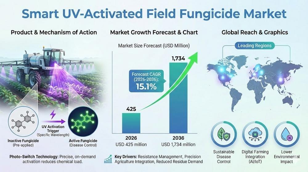 The global Smart UV-Activated Field Fungicide Market is witnessing rapid expansion as agriculture transitions toward precision-led, environmentally responsible crop protection. Valued at USD 425 million in 2026, the market is forecast to reach USD 1,734 million by 2036, registering a strong CAGR of 15.1%. UV-activated fungicides remain inactive until exposed to specific ultraviolet light conditions, ensuring targeted disease control while significantly reducing chemical overuse and environmental impact.