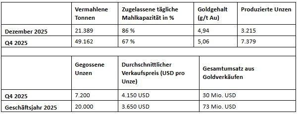 Im vierten Quartal wurden 7.200 Unzen Gold gegossen. (Anmerkung: Die gewonnenen und gegossenen Unzen stimmen aufgrund der Goldmenge im Kreislauf und des Zeitpunkts des Goldgusses nicht genau überein.) Diese Unzen wurden zu einem Durchschnittspreis von 4.150 USD pro Unze verkauft, was einem Gesamtumsatz von 30 Mio. USD entspricht.