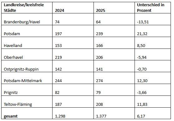 Die stärksten Zuwächse verzeichneten die Landeshauptstadt Potsdam (+21,3 Prozent) sowie die Landkreise Potsdam-Mittelmark (+12,3 Prozent) und Teltow-Fläming (+11,8 Prozent). Rückgänge gab es insbesondere in der kreisfreien Stadt Brandenburg an der Havel (-13,5 Prozent), Oberhavel (-5,9 Prozent) und Prignitz (-3,7 Prozent).