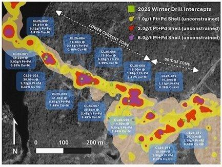 Die aktualisierten Ressourcen des Projekts Thunder Bay North wurden im November 2025 veröffentlicht (siehe Mitteilung vom 24. November). Die Lagerstätte verfügt nun über eine angedeutete Ressource von 14,9 Millionen Tonnen mit einem Gehalt von 2,66 g/t 2PGE (Pt+Pd), 0,40 % Cu und 0,24 % Ni sowie eine vermutete Ressource von 2,49 Millionen Tonnen mit einem Gehalt von 1,62 g/t 2PGE (Pt+Pd), 0,31 % Cu und 0,19 % Ni. Auf Basis des Gehalts enthält die Lagerstätte insgesamt 1,39 Mio. Unzen (Pt+Pd), darunter 67.000 Tonnen Kupfer und 41.000 Tonnen Nickel.