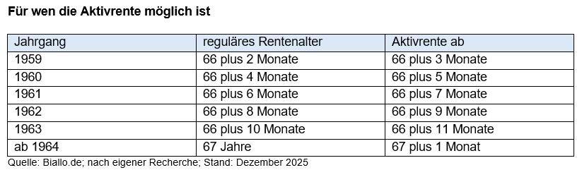 Beispiel: Sie sind am 13. Januar 1960 geboren. Als Angehöriger dieses Jahrgangs erreichen Sie Ihr reguläres Rentenalter mit 66 Jahren und vier Monaten. In Ihrem Fall also im Mai 2026. Ab dem Folgemonat, also ab Juni 2026, haben Sie Anspruch auf die reguläre Altersrente, soweit Sie diese beantragen.  Gleichzeitig steht Ihnen auch – wenn Sie weiterhin sozialversicherungspflichtig beschäftigt sind – der steuerliche „Aktivrentenfreibetrag“ von maximal 2.000 Euro zu.