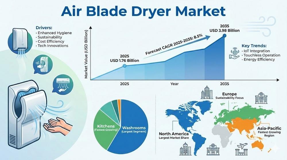 The global air blade dryer market is projected to grow from USD 1.76 billion in 2025 to USD 3.98 billion by 2035, at a CAGR of 8.5%. Growth is driven by rising hygiene standards, sustainability mandates, and the shift from paper towels to touchless, high-speed drying solutions. Airports, hospitals, and educational institutions are increasingly replacing traditional hand-drying methods with intelligent, sensor-activated systems to improve hygiene and reduce operational costs.