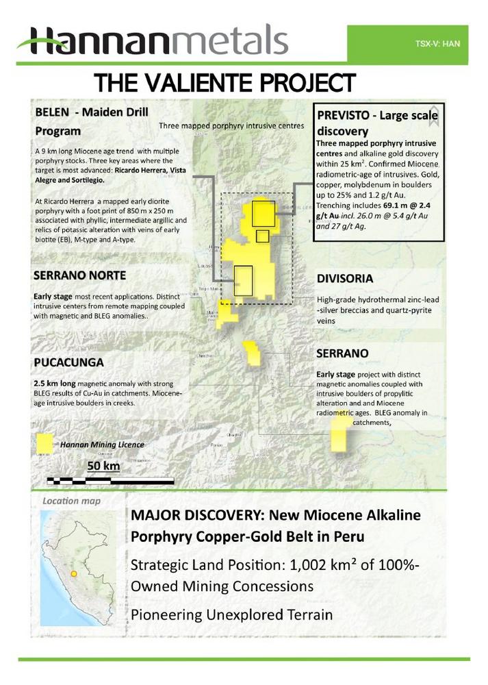 Hannan Metals Limited ("Hannan" or the "Company") (TSXV: HAN) (OTCPK: HANNF) (- https://www.commodity-tv.com/play/hannan-metals-ceo-gives-a-corporate-update-valiente-drill-results-available-shortly/ -) is pleased to announce the restart of drilling in early February 2026 and provide results from two drill holes (HDDRH001 and HDDRH002) at the Ricardo Herrera prospect from its maiden drilling campaign at the 100% owned Belen prospect, located within the permitted Valiente Declaracion de Impacto Ambiental ("DIA") area in Peru. These first-ever drill holes represent an important milestone in systematically exploring this new Miocene-aged porphyry-epithermal mineral belt in a back-arc setting.