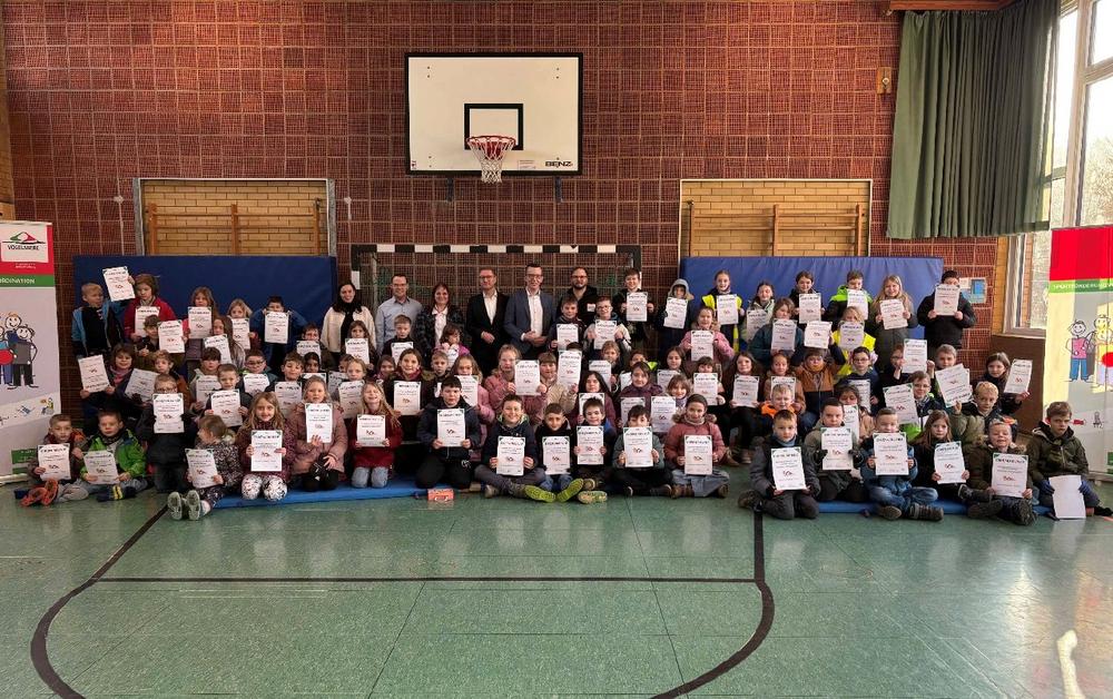 Deren 104 Schülerinnen und Schüler erreichten mit 40,36 Punkten pro Kind den höchsten Wert im Vogelsbergkreis. „Eine hervorragende Leistung, auf die ihr alle sehr stolz sein könnt“, konstatierte Landrat Dr. Jens Mischak im Rahmen einer kleinen Feierstunde in der Turnhalle der Schule. Gemeinsam mit dem Ersten Kreisbeigeordneten und Schuldezernenten Patrick Krug, Bewegungskoordinator und Projektinitiator Dominic Günther sowie dem Leiter des Amtes für schulische Bildung und Betreuung, Matthias Röse, überreichte der Landrat bewegungsfördernde Spiele als Gewinn an jede Klasse sowie für jedes Kind eine Urkunde.