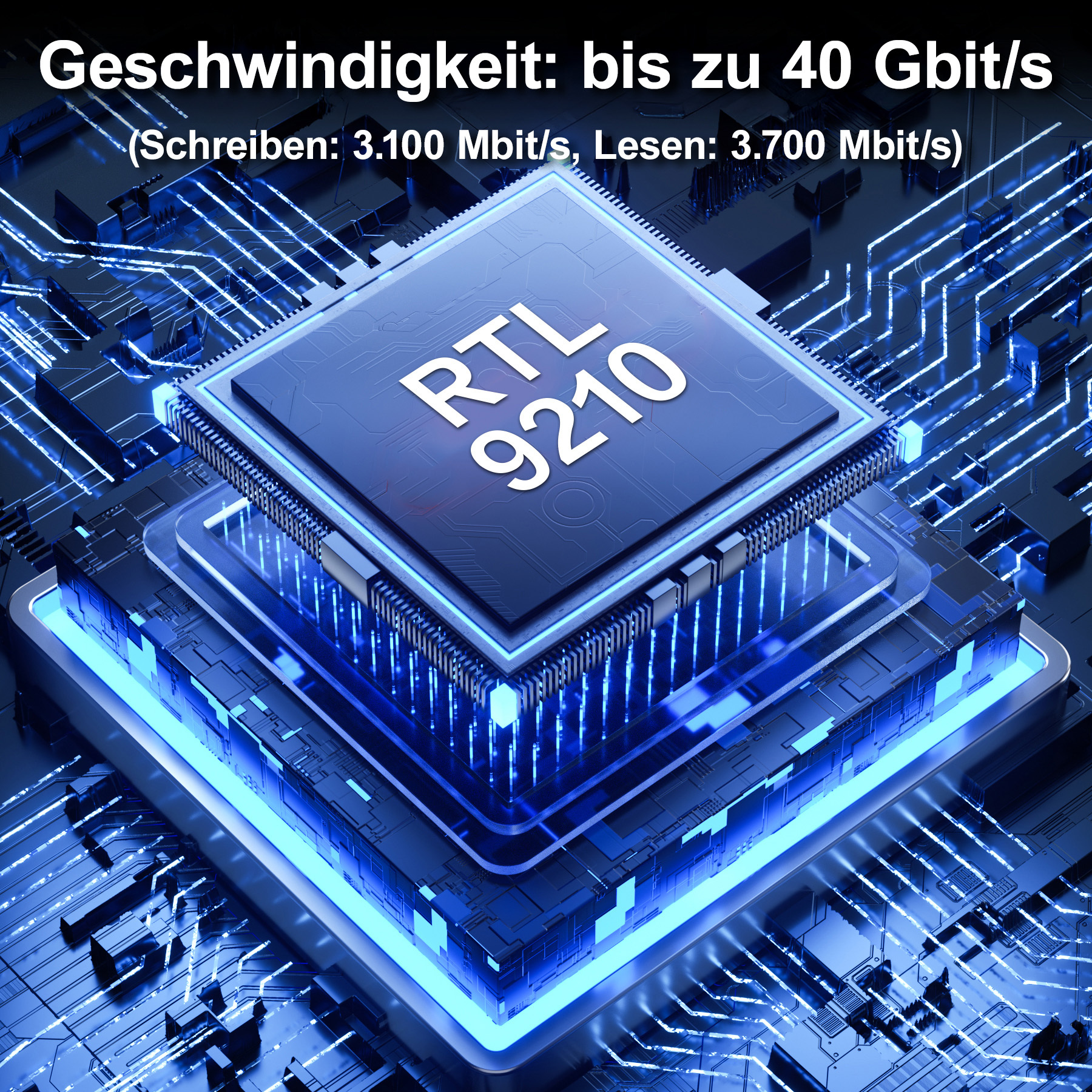 - Geschwindigkeit: bis zu 40 Gbit/s (Schreiben: 3.100 Mbit/s, Lesen: 3.700 Mbit/s)