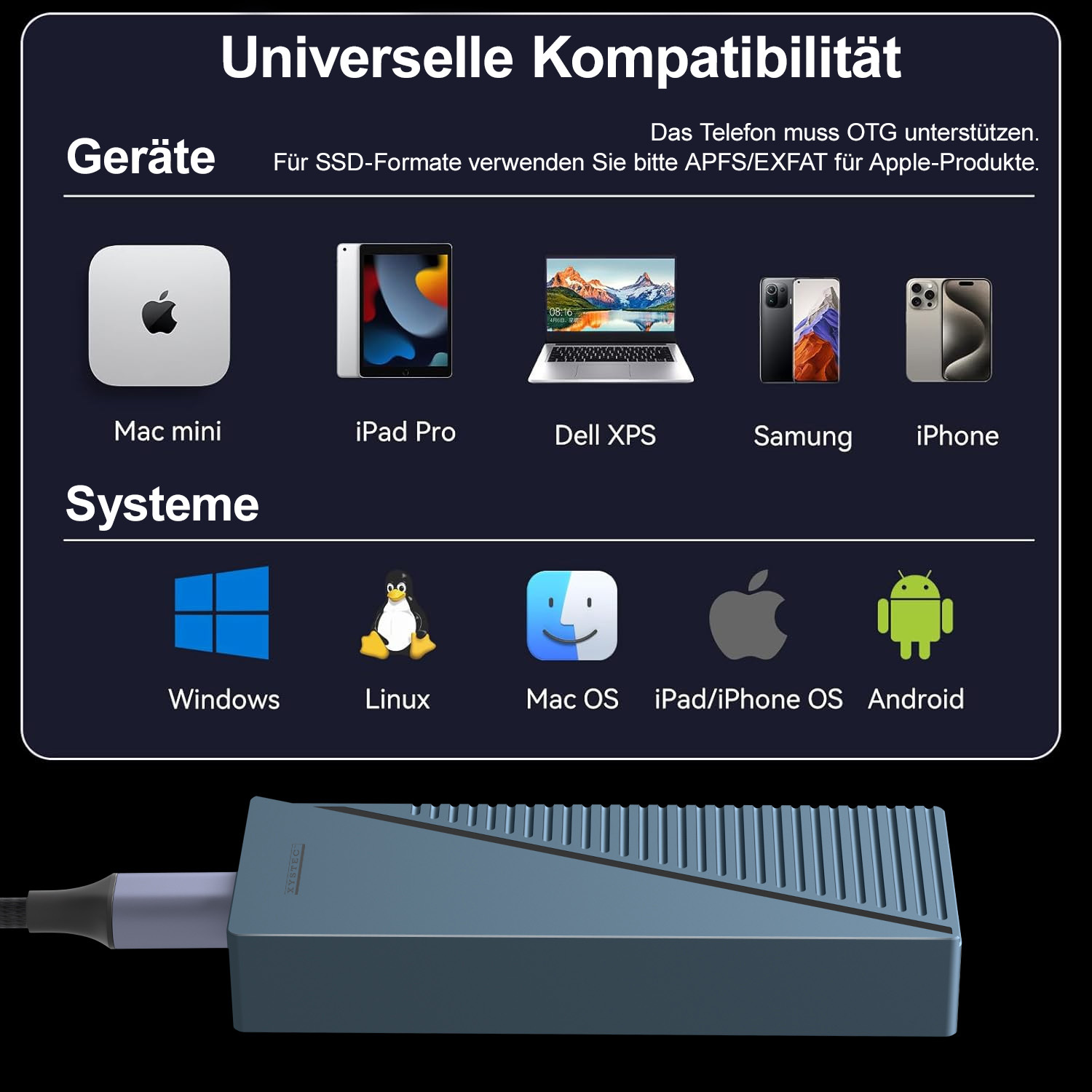 Universell kompatibel und sofort einsatzbereit: Das Gehäuse unterstützt NVMe M.2 SSDs mit Größen bis zu 2280. Dank Plug & Play lässt es sich ohne Installation direkt mit Notebooks, MacBooks oder Desktop-PCs verbinden – perfekt für den mobilen Einsatz oder den schnellen Datenaustausch im Büro.