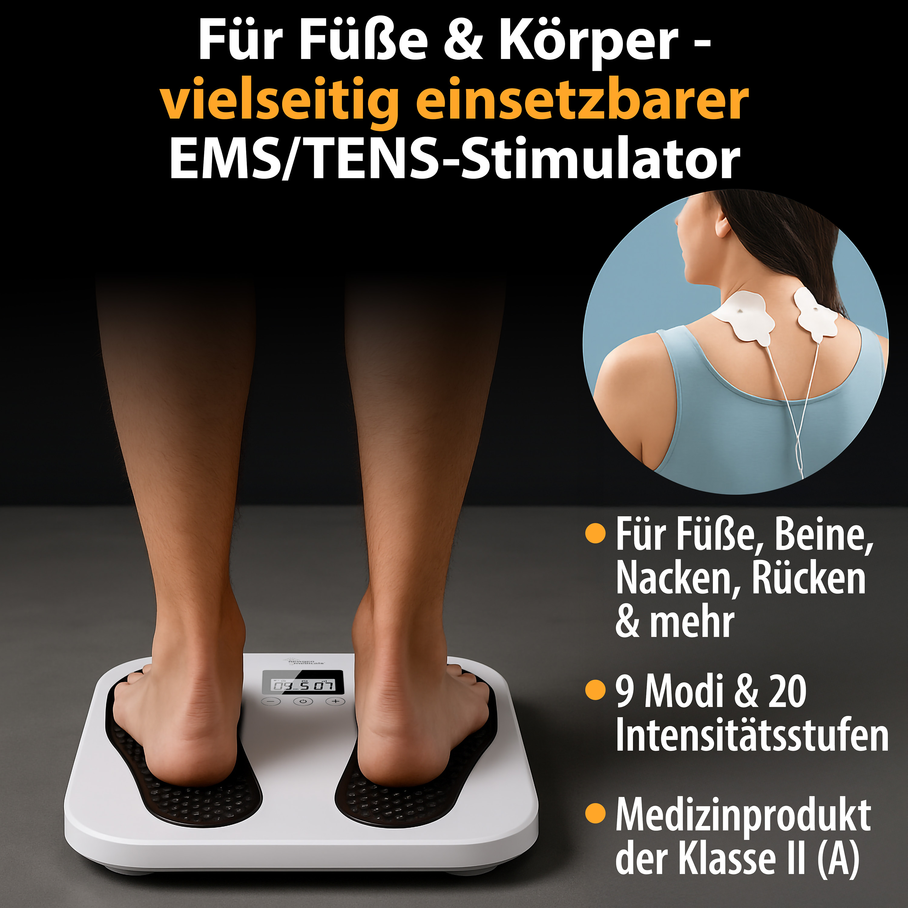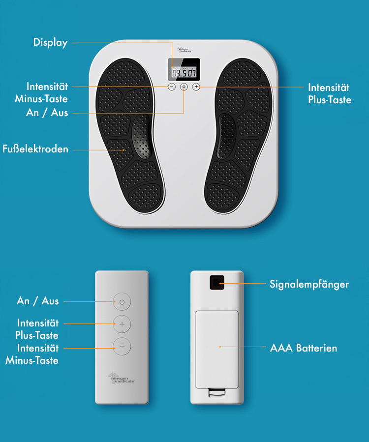 Entspannung und Schmerzlinderung durch medizinische Elektrostimulation: Der EMS- und TENS-Durchblutungsstimulator von newgen medicals eignet sich ideal zur Regeneration müder Beine und Füße. Die elektrische Muskelstimulation (EMS) lockert und aktiviert die Muskulatur, während die transkutane elektrische Nervenstimulation (TENS) sanft die Nerven anregt. Diese medizinischen Verfahren fördern die Durchblutung, lindern Schmerzen, entkrampfen und stärken die Muskeln. Die Anwendung erfolgt durch einfaches Aufstellen der Füße auf die Fußelektroden – besonders wohltuend nach langem Stehen oder intensiver Belastung.