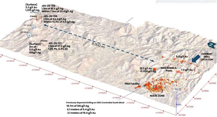 Der South Block, der sich über eine Fläche von etwa 8 km² erstreckt und zu 100 % vom Unternehmen kontrolliert wird, stellt eine direkte Erweiterung der historischen Main Zone dar. Jüngste Fortschritte, darunter der Bau einer Zufahrtsstraße und die Vorbereitung mehrerer Bohrplattformen, haben diese Wiederaufnahme ermöglicht. Die Ziele wurden durch einen bedeutenden strukturellen Komplex abgegrenzt, der mittels der drohnengestützten magnetischen Untersuchung entdeckt wurde und stark mit anomalen Gold- und Silbergehalten aus übertägigen Gesteins- und Bodenproben korreliert – diese enthielten in früheren Programmen bis zu 21,2 g/t Au und über 2.000 g/t Ag (Pressemitteilung vom 12. November 2024).