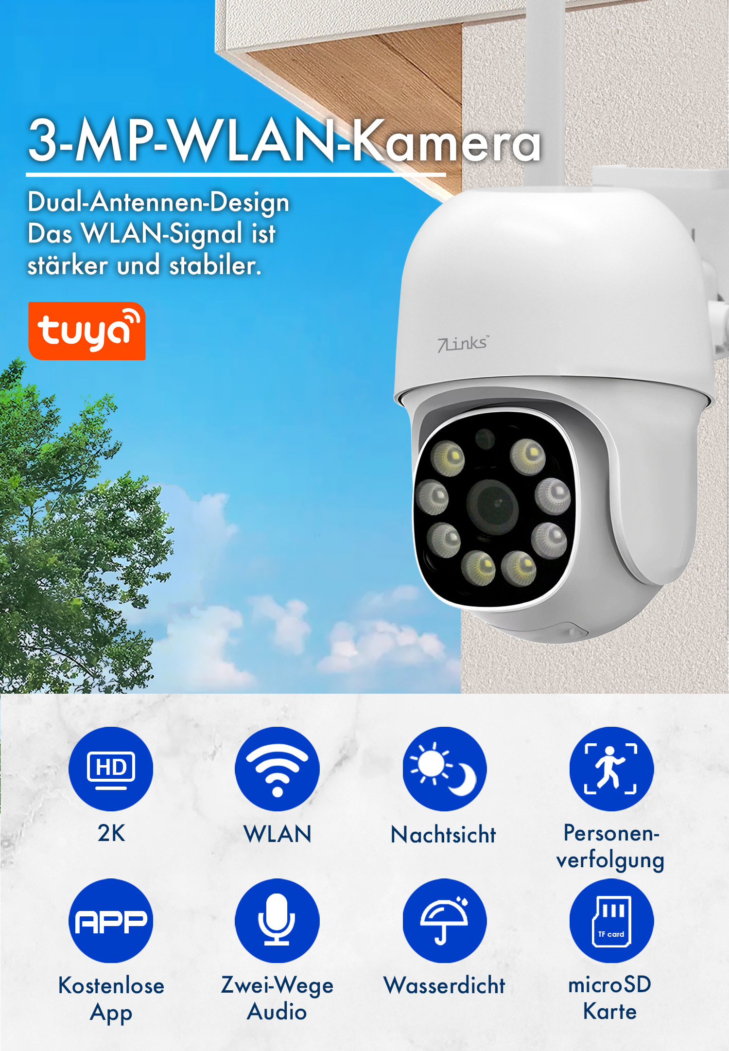 Die 7links WLAN-Pan-Tilt-Outdoorkamera IPC-905.track, 2K, mit Tonerkennung, Farb-Nachtsicht und Sirene ist ab sofort bei pearl.de unter der Bestellnummer ZX-5870-625 zum Preis von 27,99 EUR erhältlich. Das Produkt ist auch bei emall.com_Schweiz verfügbar.