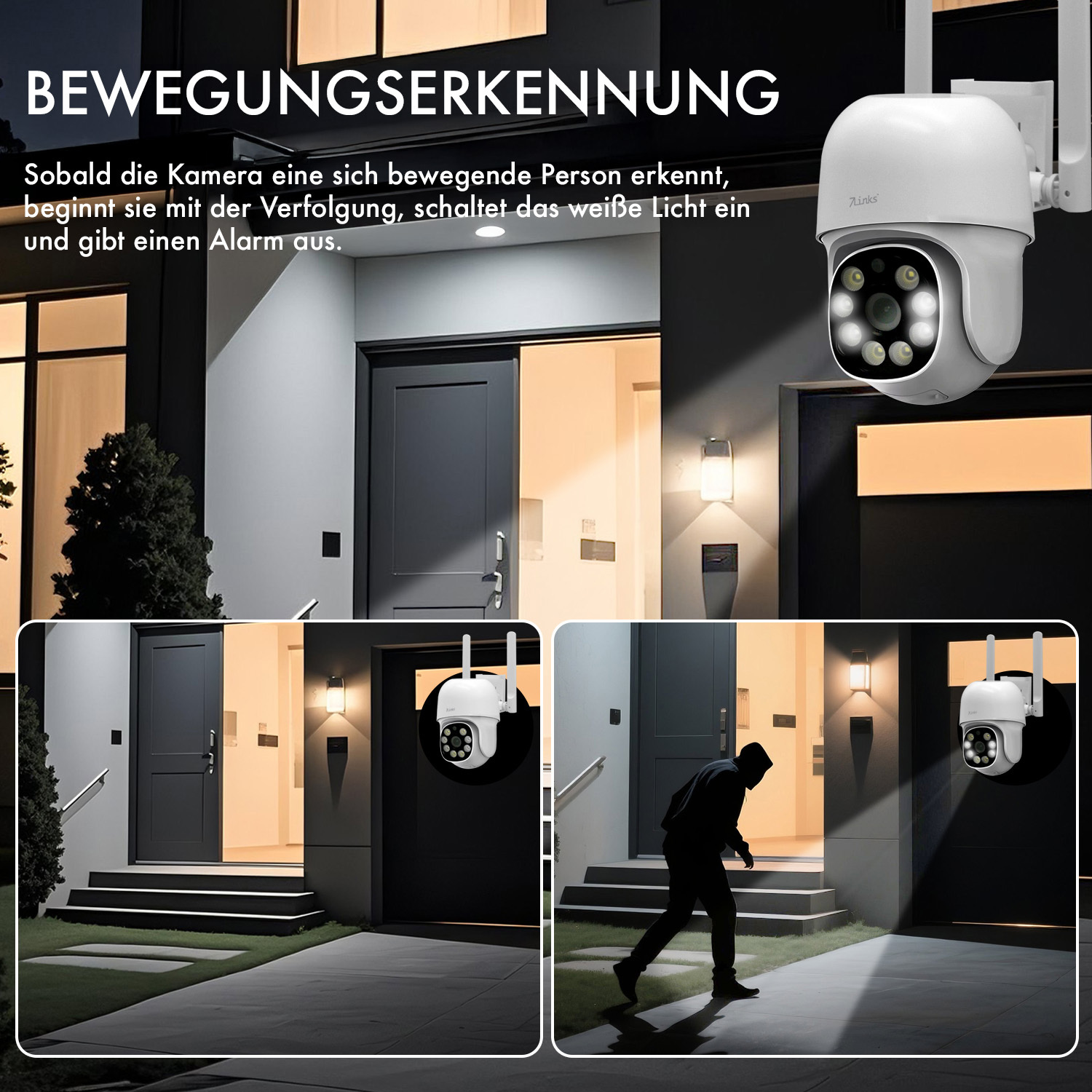 Bewegungs- und Geräuscherkennung mit automatischer Objektverfolgung:Die Kamera reagiert sowohl auf Bewegung als auch auf verdächtige Geräusche wie laute Stimmen oder Glasbruch und startet in diesen Fällen automatisch die Aufnahme. Das integrierte Objekt-Tracking verfolgt Menschen, Fahrzeuge und Tiere im Bildausschnitt. Eine zuschaltbare Personenerkennung filtert gezielt verdächtige Personen heraus.