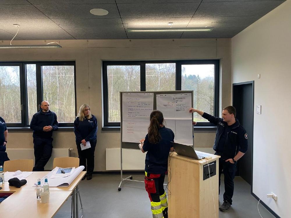 Nach den theoretischen Unterrichtsblöcken wurde es praktisch: In Gruppenarbeit wurden unterschiedliche Einsatzszenarien betrachtet. Im Anschluss wurden die jeweiligen fiktiven Einsatzstellen angefahren. Durch die praktischen und theoretischen Übungseinheiten wurde insbesondere die Zusammenarbeit den unterschiedlichen Führungsebenen geübt. Gerade der Perspektivwechsel im Hinblick auf Führungs- und Entscheidungsprozesse im Einsatz konnte durch die interdisziplinäre Zusammenarbeit auf Führungsebene weiterentwickelt werden.