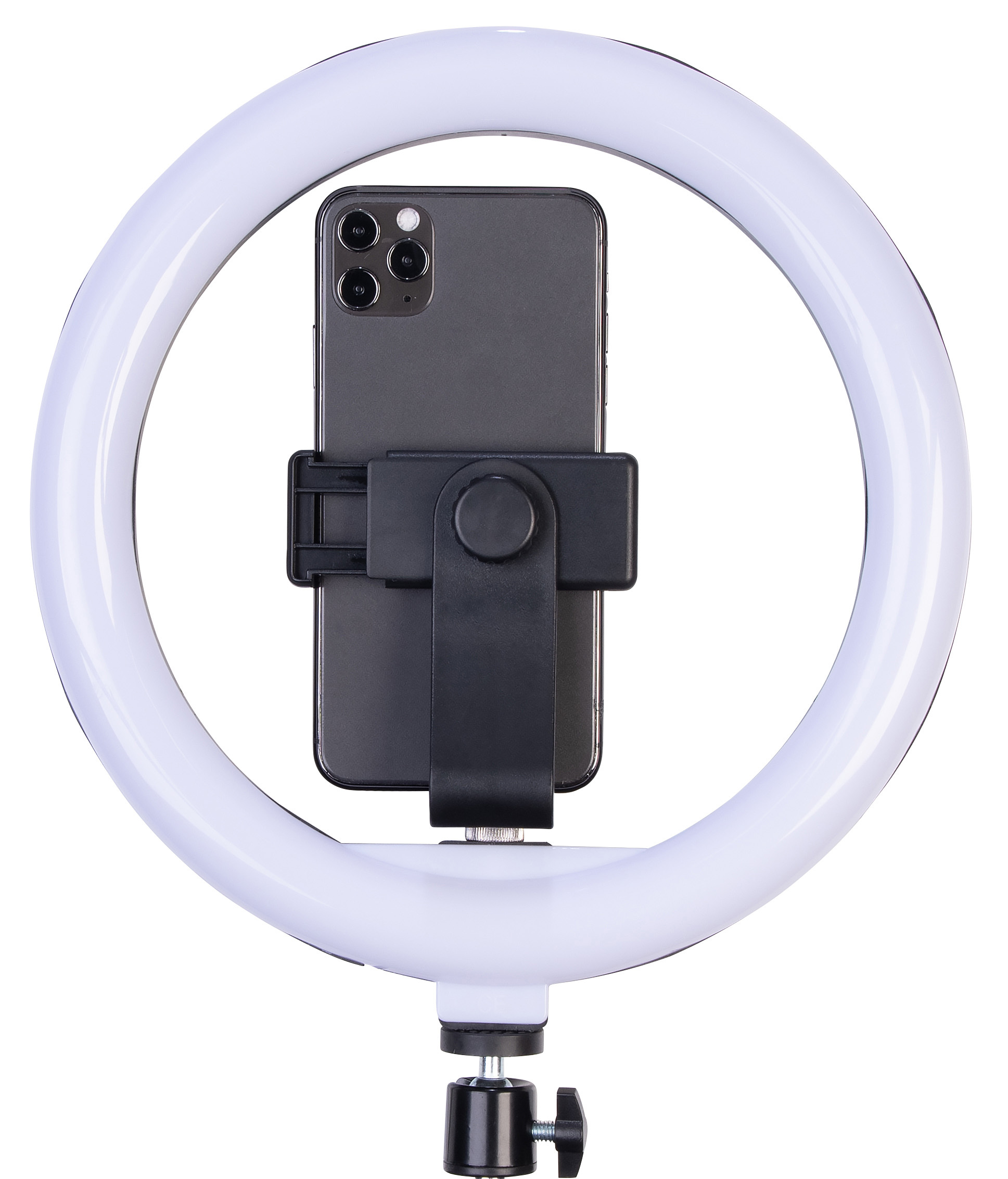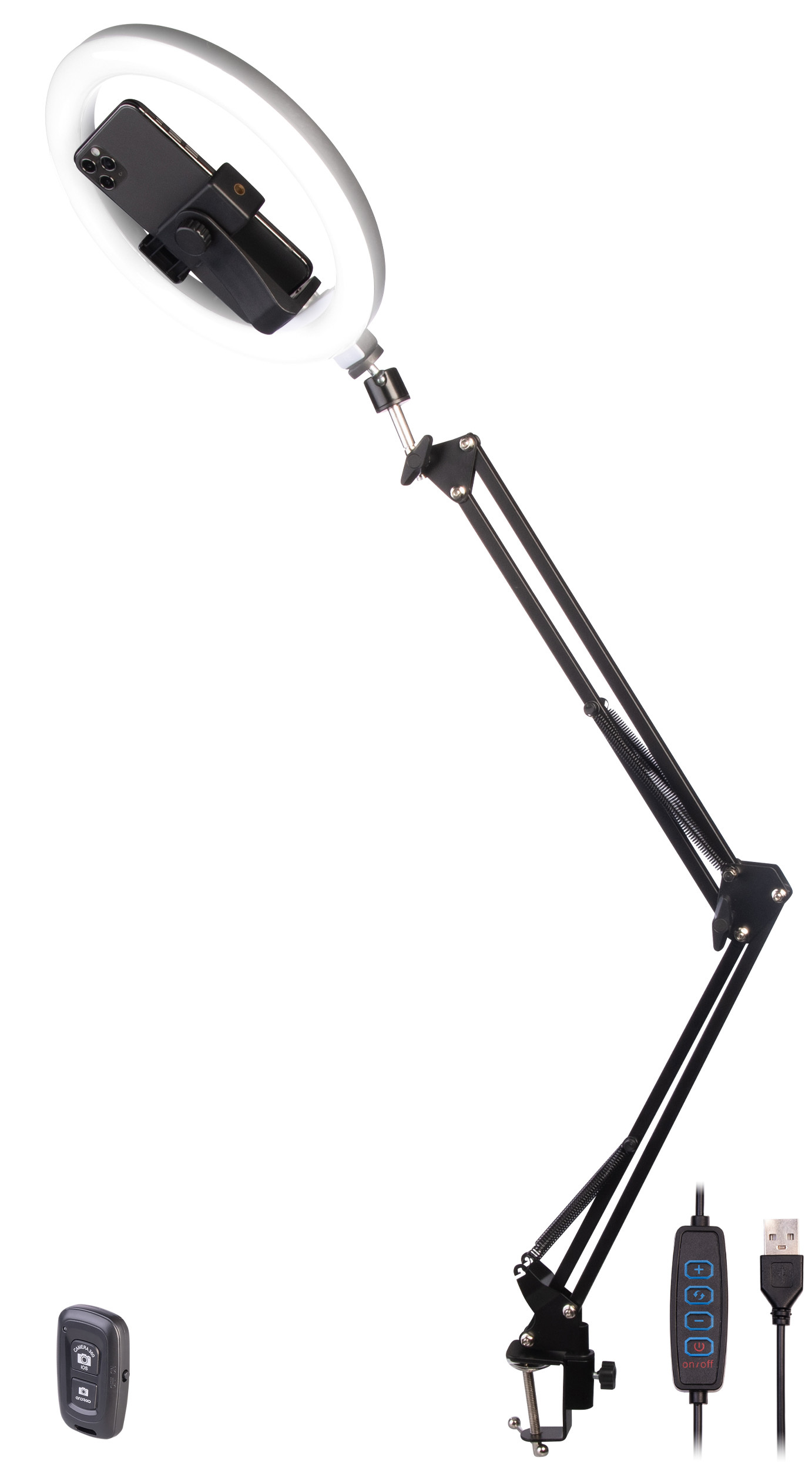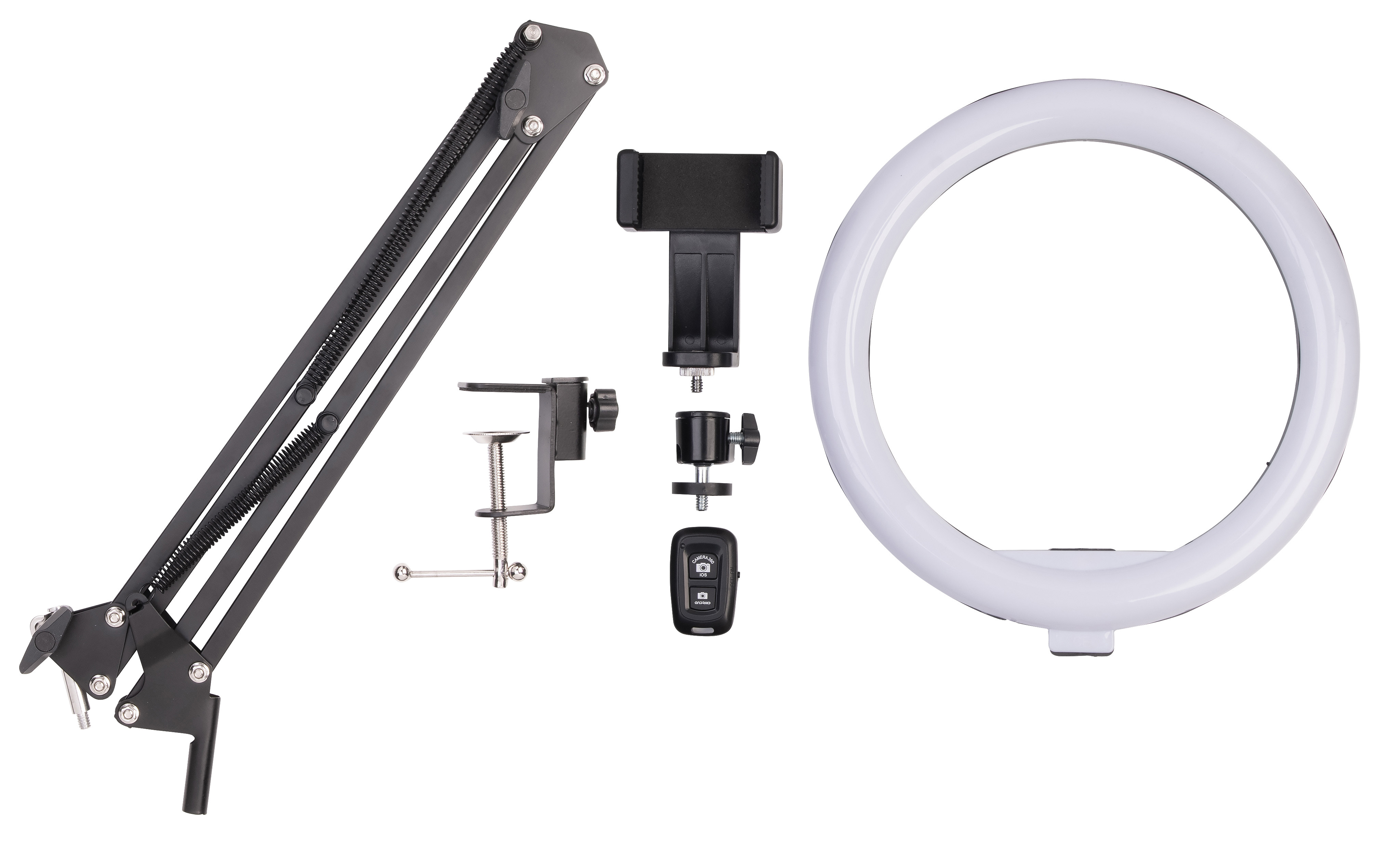 - Ringlicht inklusive gefedertem Stativ, Smartphone-Halter, Funk-Fernauslöser und deutscher Anleitung